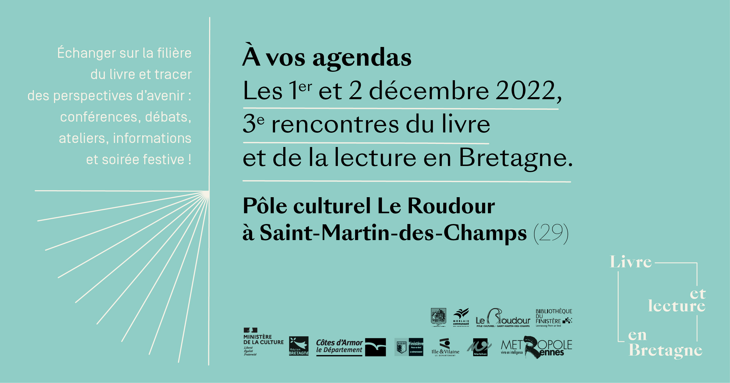 Les 1er et 2 décembre 2022, les troisièmes Rencontres du livre et de la lecture en Bretagne se dérouleront au Pôle culturel Le Roudour à Saint-Martin-des-Champs (29).