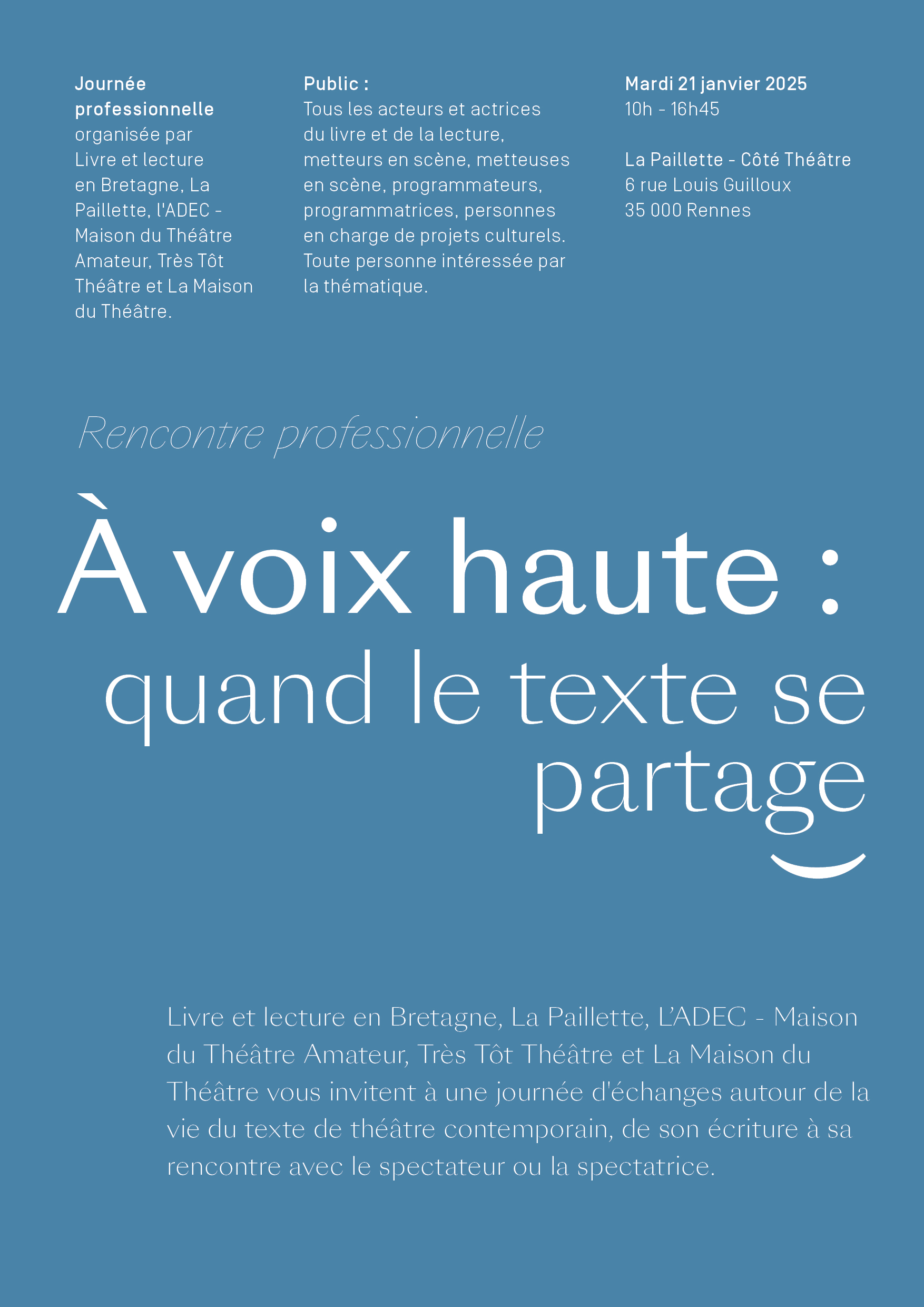 Livre et lecture en Bretagne, La Paillette, L’ADEC - Maison du Théâtre Amateur, Très Tôt Théâtre et La Maison du Théâtre vous invitent à une journée d'échanges autour de la vie du texte de théâtre contemporain, de son écriture à sa rencontre avec le spectateur ou la spectatrice le 21 janvier 2025.