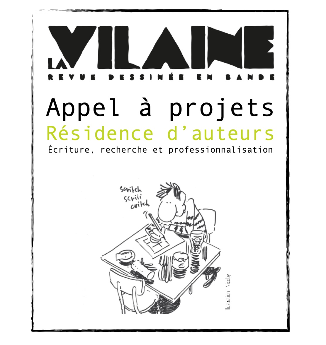 Pour la 2e année, la Vilaine propose une résidence d'écriture à destination d'auteurs BD ayant un projet de BD long (hors publication La Vilaine).